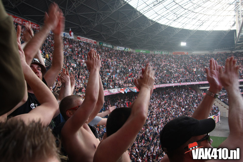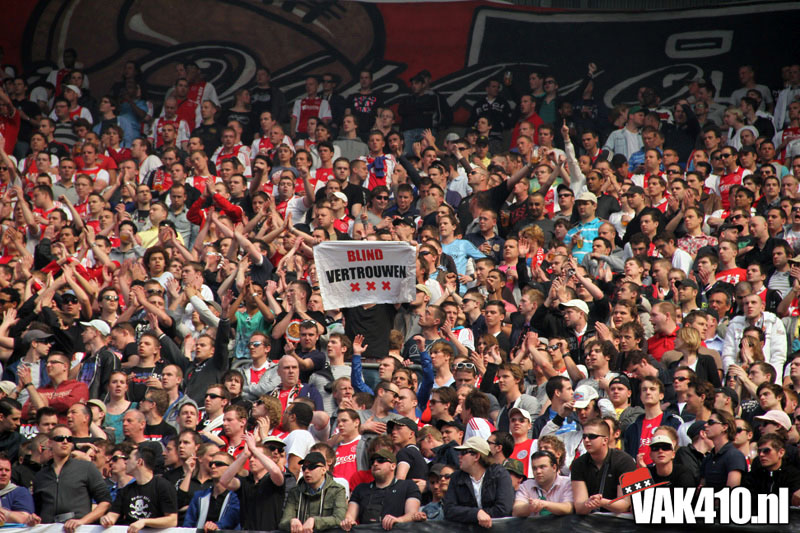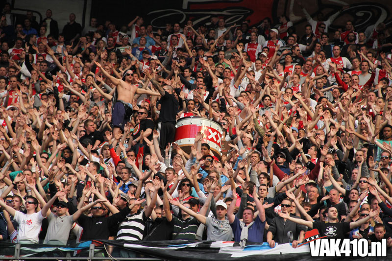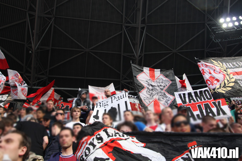 Op 410 stond vandaag een wereld primeur op het menu: ULTRA 3D VISION. Voordat het doek werd gehesen werden op het vak honderden zwarte zonnebrillen ingeruild voor 3d brilletjes. De wereld waarin wij leven is nou eenmaal driedimensionaal. Op het doek kwamen de leeuw, Ajax en 410 tot leven. Nee, ze kwamen eruit.